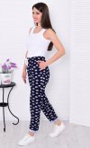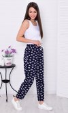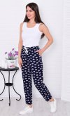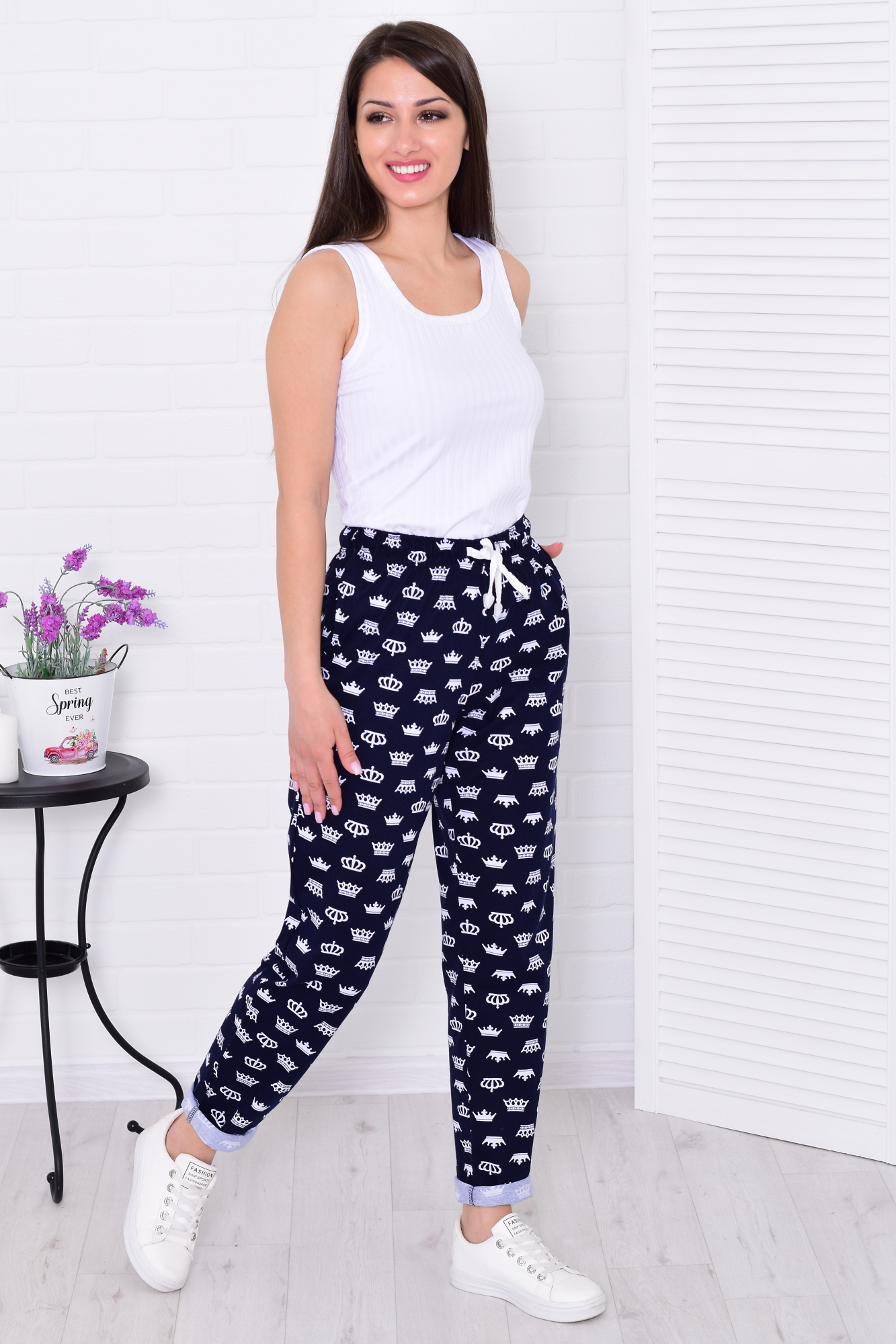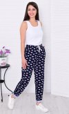 Брюки свободного покроя, слегка зауженные к низу, с двумя боковыми карманами. Пояс на широкой резинке со шнуром. Длина по боковому шву: 42-92 см, 44-93 см, 46-94 см, 48-95 см, 50-96 см, 52-97 см, 54-98 см, 56-99 см, 58-100 см, 60-101 см. Длина по шаговому шву: 42-69 см, 44-69 см, 46-69 см, 48-69 см, 50-70 см, 52-70 см, 54-70 см, 56-70 см, 58-70 см, 60-70 см. Подкладки нет, без застежки. Плотность ткани: тонкая. Карманы в боковом шве. Шнур и резинка в поясе. Посадка средняя. Уход: деликатная стирка в машине при 30 градусах отдельно от других вещей.