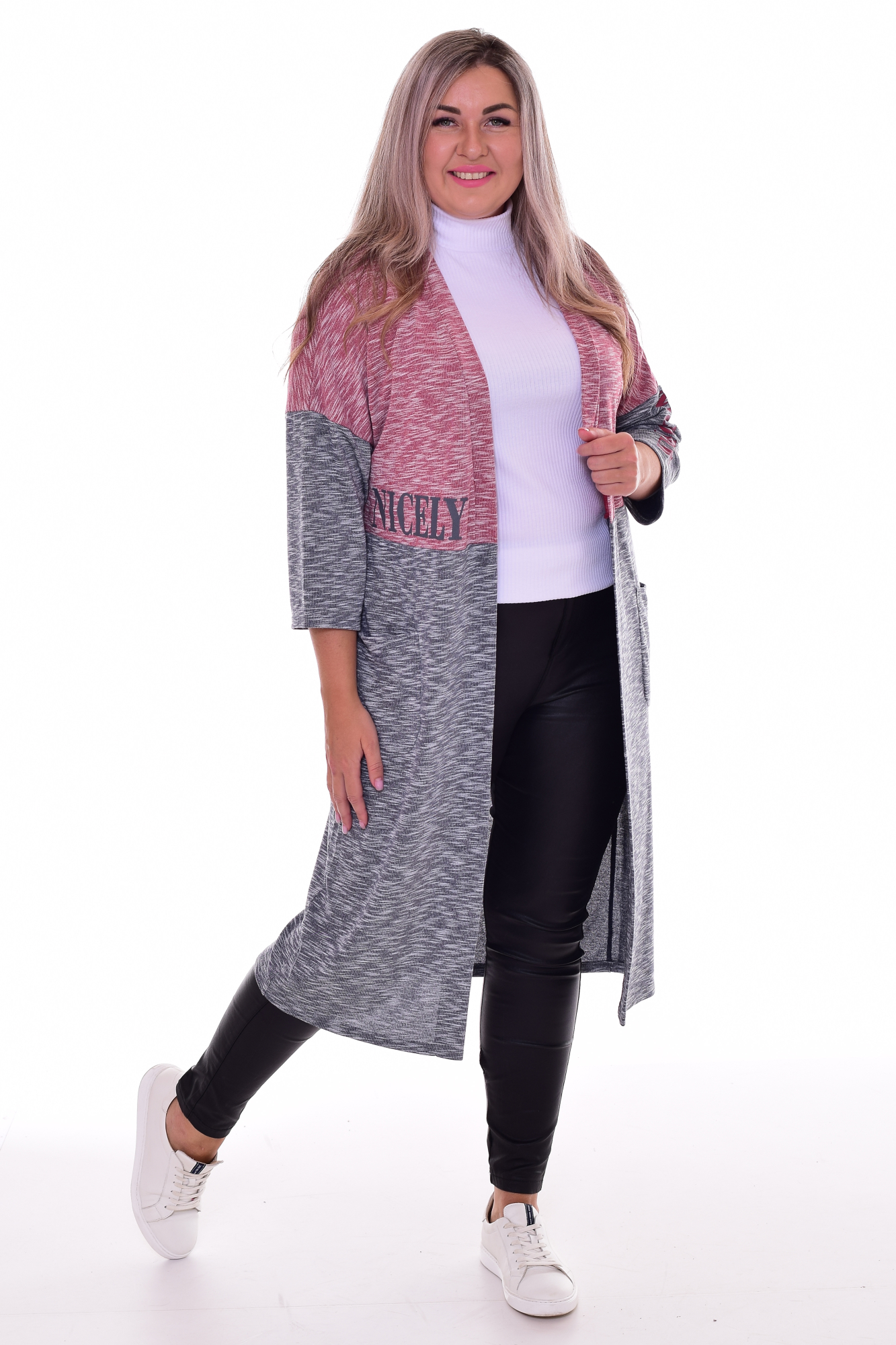 Кардиган женский из плательной ткани. Рукав длинный . Накладные карманы . Принт в виде печати на рукаве и правой полочке. Длина изделия : 44 р. - 107 см, 46 р. - 107 см, 48 р. - 107 см, 50 р.- 108 см, 52 р. - 108 см, 54 р. - 109 см, 56 р. - 109 см, 58 р. - 110 см, 60 р. - 110 см.