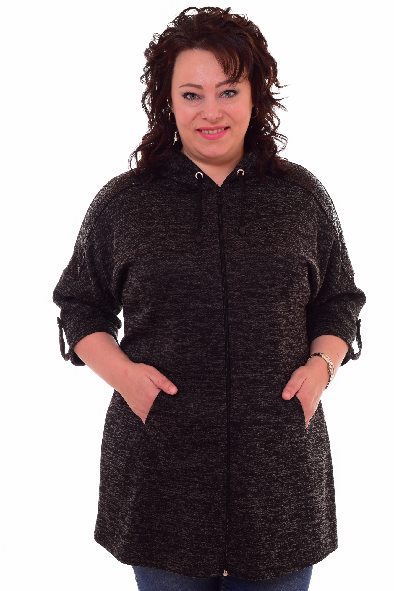 Кардиган женский из ткани » Сандра». Рукав приспущенный три четверти с патами. Накладной карман - кенгуру . Капюшон с люверсами и шнуром. Молния. Вставка на плечах в виде пагонов из другой ткани. Сзади разрез, вставлен шнурок. Длина изделия : 48 р. - 78 см, 50 р.- 79 см, 52 р. - 79 см, 54 р. - 80 см, 56 р. - 80 см, 58 р. - 83 см, 60 р. - 83 см.