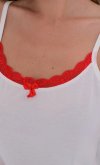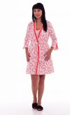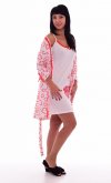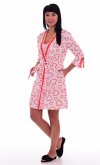 Сорочка по краю горловины отделана красным кружевом, в левом нижнем углу переда расположен оригинальный принт. Халат прямого силуэта. Посадка по фигуре регулируется поясом. Борта , горловина и разрезы рукавов отделаны кружевом.