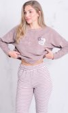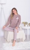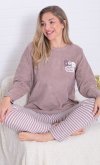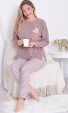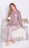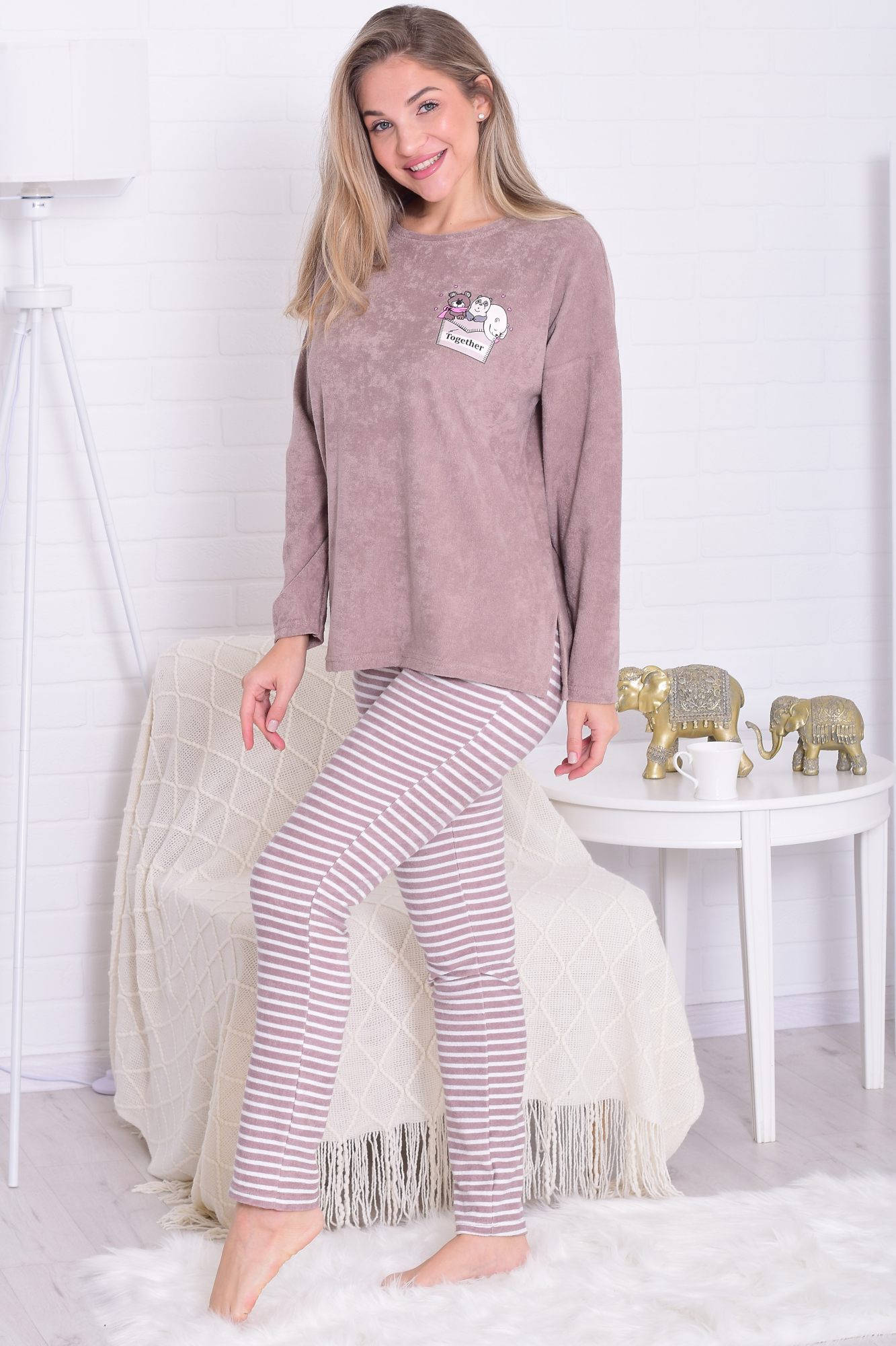 Состав: 70%-хлопок, 30%-пэ Пижама жнская из мягкой махры премиум качества. Однотонный джемпер свободного кроя со спущенной проймой и длинными рукавами, горловина круглая, по бокам разрезы на полочке, принт с забавными медведями. Брюки прямые в полоску, не широкие, с двумя боковыми карманами на широком поясе с резинкой. Длина джемпера по спинке: 42-64 см, 44-65 см, 46-66 см, 48-67 см, 50-68 см, 52-70 см, 52-70 см, 54-72 см, 56-73 см, 58-74 см, 60-75 см. Длина брюк по боковому шву: 42-102 см, 44-103 см, 46-104 см, 48-104 см, 50-104, 52-105 см, 54-105 см, 56-106 см, 58-107 см, 60-107 см. Длина брюк по шаговому шву: 42-77 см, 44-77 см, 46-77 см, 48-77 см, 50-77 см, 52-77 см, 54-77 см, 56-77 см, 58-76 см, 60-76 см. Подкладки нет. Застежки нет. Плотность ткани: средняя. Карманы в боковом шве брюк. Комплектация: джемпер и брюки. Резинка в поясе брюк. Декор: принт на полочке. Высота посадки: средняя. Уход: деликатная стирка в машине при 30 градусах отдельно от других вещей.