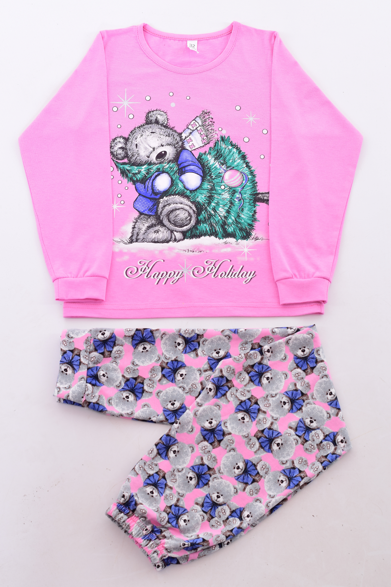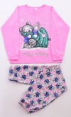 Пижама подростковая из кулирки с принтом в виде печати - «мишка с елкой». Горловина окантованная. Футболка с длинным рукавом на манжете. Брюки прямого покроя, к низу немного заужены , манжет. Верх резинка. Длина изделия по спинке: 36 р - 45 см, 38 р. - 46 см, 40 р. - 47см. Длина изделия по боковому шву: 36 р - 93 см, 38 р. - 94 см, 40 р. - 95 см. Длина изделия по шаговому шву: 36 р - 72 см, 38 р. - 74 см, 40 р. - 76 см.