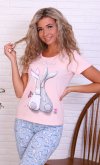 Нежная женская пижама с оригинальным принтом. Брюки прямого силуэта, зауженные книзу. Верх брюк на резинке. Подкладки нет. Застежки нет. Плотность ткани: тонкая. Комплектность: футболка и брюки. Резинка в поясе брюк. Декор: принт на футболке. Высота посадки: средняя. Уход: деликатная стирка в машине при 30 градусах отдельно от других вещей.