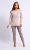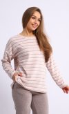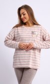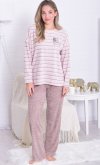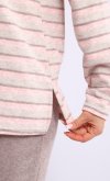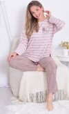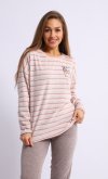 Пижама женская из мягкой махры премиум качества. Однотонный джемпер свободного кроя со спущенной проймой и длинными рукавами, горловина круглая, по бокам разрезы на полочке, принт с забавными медведями. Брюки прямые в полоску, не широкие, с двумя боковыми карманами на широком поясе с резинкой. Длина джемпера по спинке: 42-64 см, 44-65 см, 46-66 см, 48-67 см, 50-68 см, 52-70 см, 52-70 см, 54-72 см, 56-73 см, 58-74 см, 60-75 см. Длина брюк по боковому шву: 42-102 см, 44-103 см, 46-104 см, 48-104 см, 50-104, 52-105 см, 54-105 см, 56-106 см, 58-107 см, 60-107 см. Длина брюк по шаговому шву: 42-77 см, 44-77 см, 46-77 см, 48-77 см, 50-77 см, 52-77 см, 54-77 см, 56-77 см, 58-76 см, 60-76 см. Подкладки нет. Застежки нет. Плотность ткани: средняя. Карманы в боковом шве брюк. Комплектация: джемпер и брюки. Резинка в поясе брюк. Декор: принт на полочке. Высота посадки: средняя. Уход: деликатная стирка в машине при 30 градусах отдельно от других вещей.