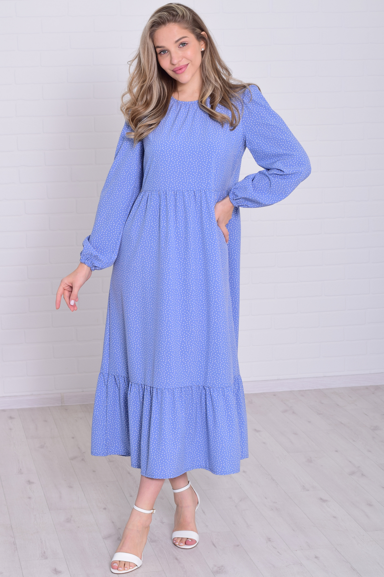 Рост: 164-170. Состав: 100%-ПЭ. Платье свободного кроя в длине миди, А-силуэт в расцветке мелкий горошек. Горловина круглая, рукав длинный- фонарик, по окату рукава и низ рукава присборен. По низу платья широкая оборка. При желании можно к платью подобрать пояс и подчеркнуть линию талии. Ткань шелковистая, очень приятная к телу. Длина платья: 46-128 см, 48-129 см, 50-130 см, 52-131 см, 54-132 см, 56-133 см. Длина рукава: 46-63 см, 48-63 см, 50-63 см, 52-64 см, 54-64 см, 56-64 см.