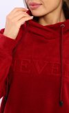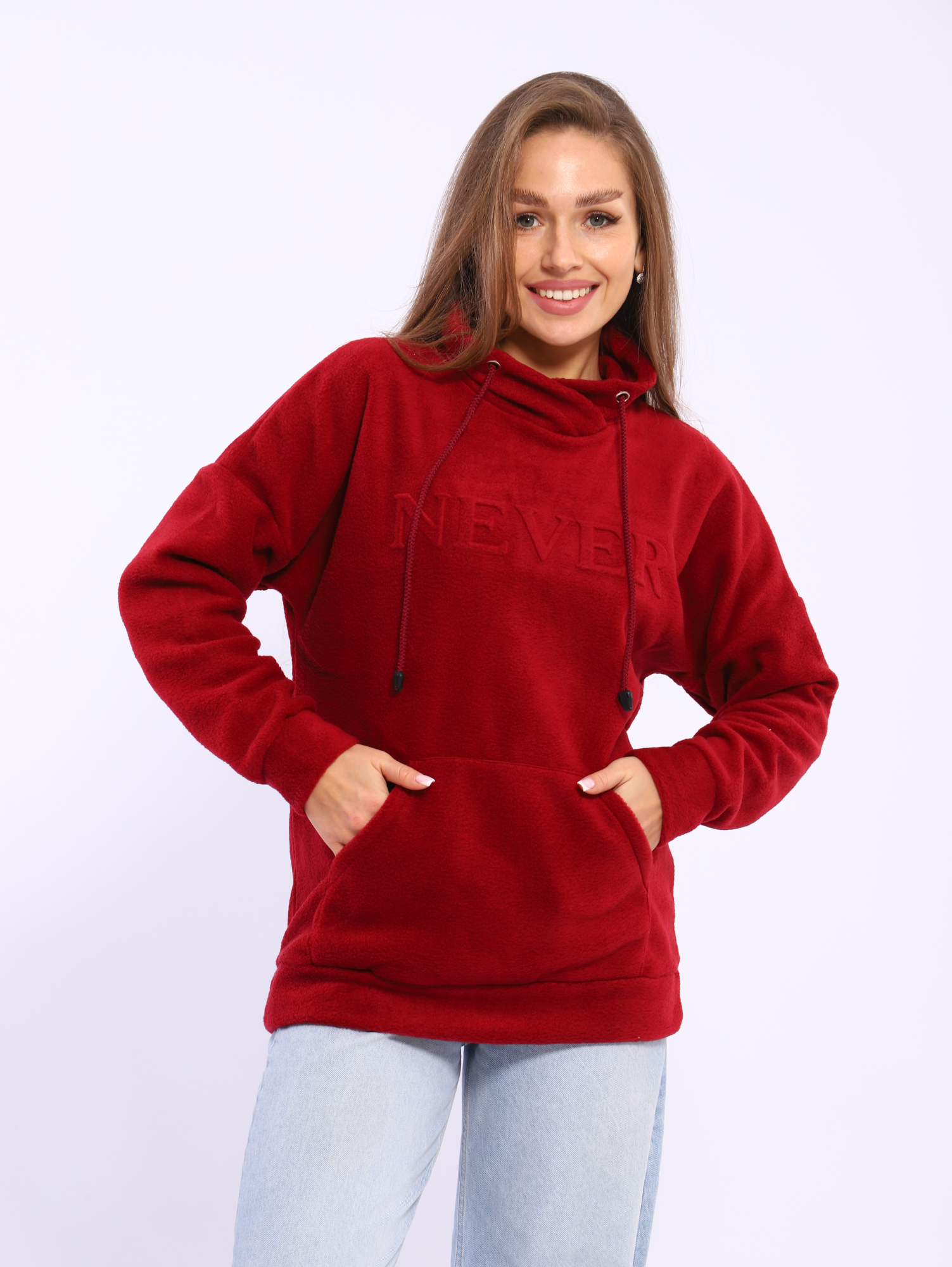 Оригинальная женская толстовка из трикотажа флис. Горловина стойка-нахлест со шнуром и люверсами. Рукав длинный на манжете. Низ - пояс. Удобный карманый -кенгуру . Длина изделия по спинке: 42 р - 62 см, 44 р. - 63 см, 46 р - 64 см, 48 р - 65 см, 50 р. - 66 см, 52 р. - 67 см, 54 р - 68 см, 56 р - 79 см. Подкладки нет. Застежки нет. Плотность ткани: плотная. Карман-кенгуру. Декор: на полочке декоративное тиснение. Уход: деликатная стирка в машине при 30 градусах отдельно от других вещей.