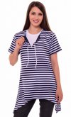 Туника удлиненная А-образный силуэт, низ с ассиметричными удлиненными углами, горловина на шнуровке и отделкой синего цвета, рукав короткий. Длина изделия по центру спинки: 46-72 см, 48-73 см, 50-76 см, 52-76 см, 54-77 см, 56-78 см, 58-80 см, 60-81 см. Белая футболка в комплект не входит.
