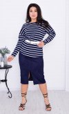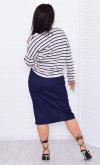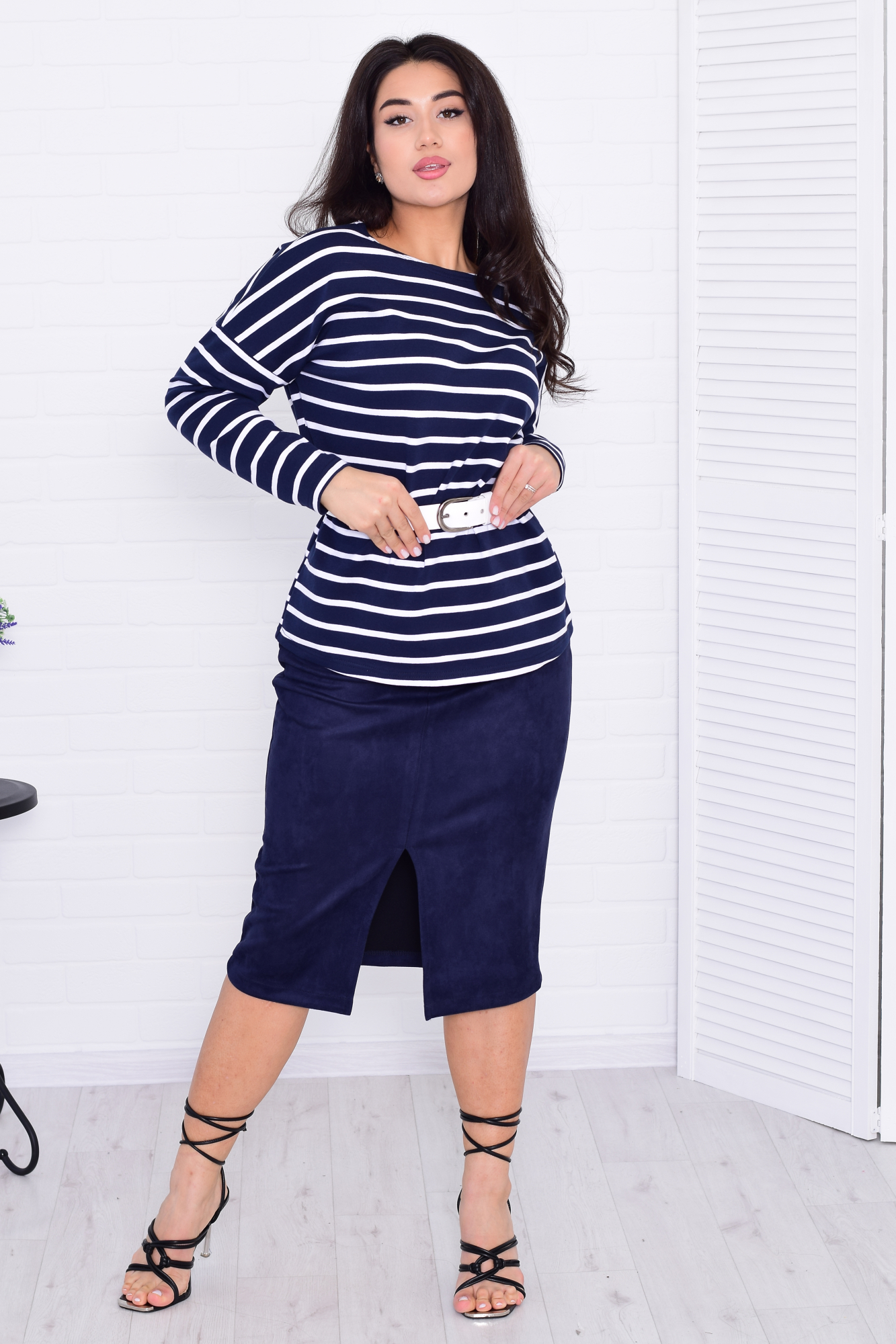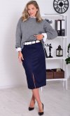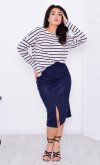 Женская юбка прямого кроя из искусственной замши с разрезом спереди. Пояс на резинке. Длина по боковому шву: 44-73,5 см, 46-74 см, 48-74 см, 50-74,5 см, 52-75 см, 54-75,5 см, 56-76 см.